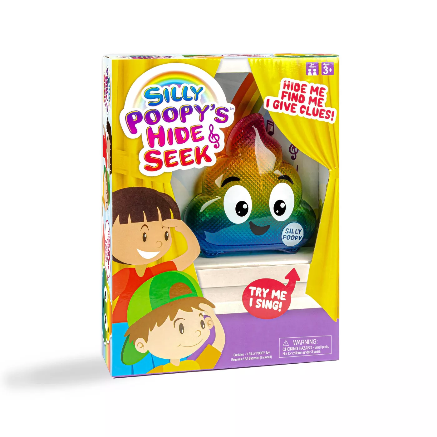 Silly Poopy’s Hide & Seek™ features a colorful rainbow design in the shape of a Poop Emoticon that plays off one of the most popular and evergreen play patterns of all time — hide and seek. With Silly Poopy it’s as easy as 1, 2, 3! Just HIDE Silly Poopy, LOOK for Silly Poopy, and FIND Silly Poopy to hear the reward song that will make you want to dance!